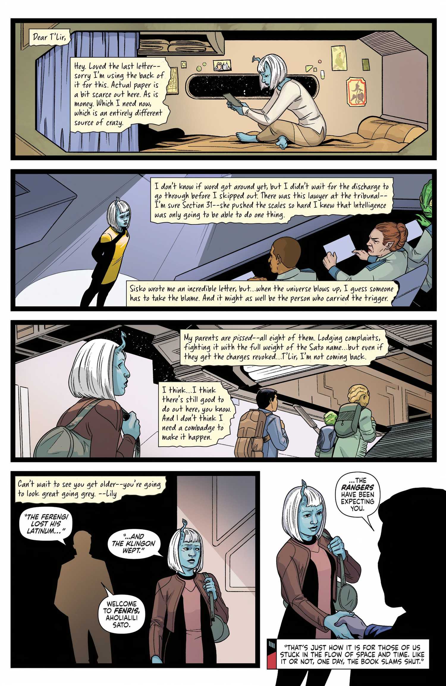 Star Trek Omega fue escrito por Christopher Cantwell, Jackson Lanzing y Collin Kelly y dibujado por cada artista que ha trabajado en la serie hasta ahora. Lily Sato ha sido tamborzada de la Flota Estelar, y ahora debe lidiar con la vergüenza de su familia. Sato le dice a su amiga T’lir que incluso si su familia consigue los cargos, no regresará a Starfleet. Entonces, se ve a Sato conociendo a un misterioso extraño, que la da la bienvenida a los “Rangers”.
