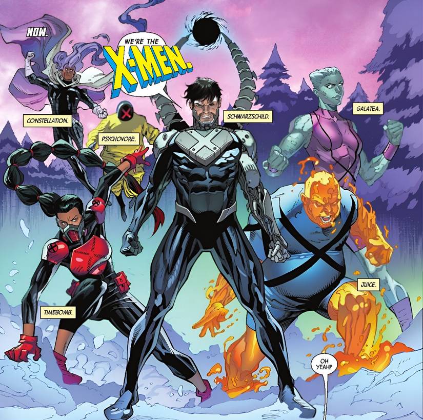 Si bien pueden ser nuevos en sus poderes, los 3k X-Men no son nada menos que impresionantes. Liderar al equipo en el campo es Negroun mutante de 3k con el poder de manipular campos gravitacionales. Lo siguiente es Bomba de tiempoun Speedster estándar de Marvel. Entonces, tenemos Jugoun mutante cuyo cuerpo siempre está en un estado semi-líquido, con el poder de endurecer sus ridas líquidas en ámbar endurecido. Lo siguiente es Galateacuyo cuerpo está compuesto de piedra viva. Entonces, hay Constelaciónque posee control sobre la energía cósmica. Y finalmente, hay Psicovoroun mutante de 3k con el poder de consumir las mentes de los demás.