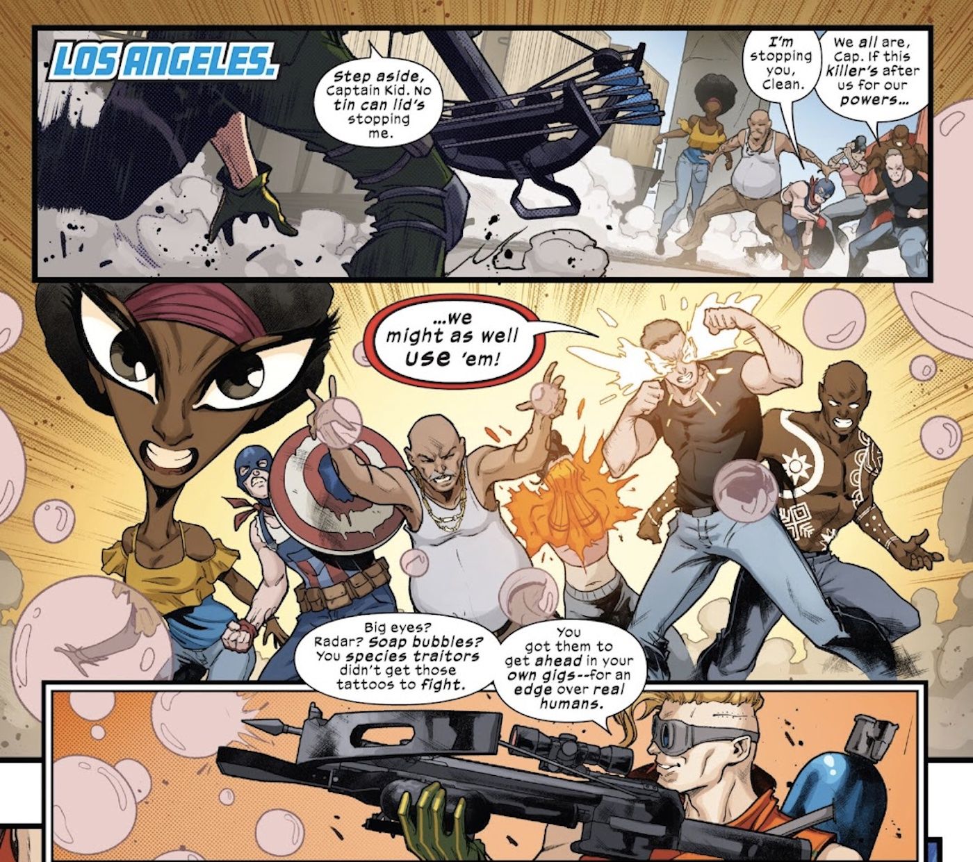 El diálogo en el cómic confirma que sus poderes provienen de los tatuajes. Sin embargo, están con el Capitán América de los Ferrocarriles tratando de escapar del sentimiento antimutante de sus vecinos, demostrando que no son una banda de criminales sino humanos que solo querían poderes geniales.