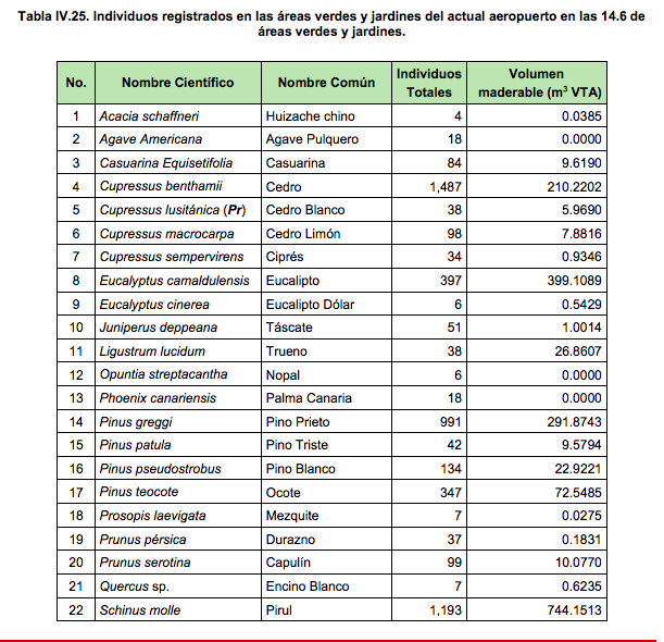 5 mil 196 árboles de 26 especies diferentes serán tirados para la construcción del Aeropuerto Internacional de Santa Lucía, de acuerdo con la Manifestación de Impacto Ambiental, elaborada por el Instituto de Ingeniería de la Universidad Nacional Autónoma de México (UNAM).