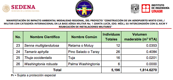 5 mil 196 árboles de 26 especies diferentes serán tirados para la construcción del Aeropuerto Internacional de Santa Lucía, de acuerdo con la Manifestación de Impacto Ambiental, elaborada por el Instituto de Ingeniería de la Universidad Nacional Autónoma de México (UNAM).