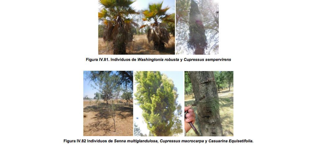 Las especies que concentran la mayor cantidad de volumen maderable estimado a remover son: Cupressus benthamii (Cedro), Schinus molle (Pirul), Pinus greggi (Pino Prieto), Pinus teocote (Ocote) y Eucalyptus camaldulensis (Eucalipto). Estas 5 especies concentran el 94.6% del volumen total calculado. Es importante señalar que las especies Phoenix canariensis (Palma Canaria), Washingtonia robusta (Palma Washingtonia) y Opuntia streptacantha (Nopal), no son árboles o especies que produzcan madera por lo que no se determinaron volúmenes maderables para estas especies. Con respecto al número de individuos totales, las especies que concentran la mayor cantidad de elementos vegetales son: Cupressus benthamii (Cedro) y Schinus molle (Pirul). Estas dos especies concentran el 51.6% del total señalado.