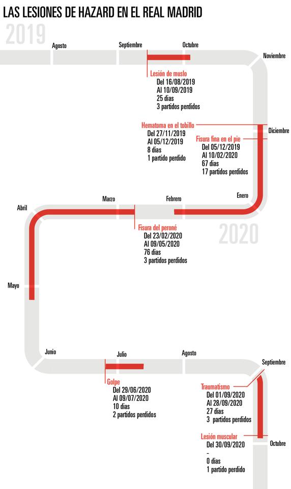 Haciendo una radiografía de Hazard, el inicio de esta película de terror data del 16 de agosto de 2019, cuando el ex del Chelsea, recién aterrizado en LaLiga, sufrió una lesión en el recto anterior de su muslo izquierdo que le hizo estar KO durante 25 días.