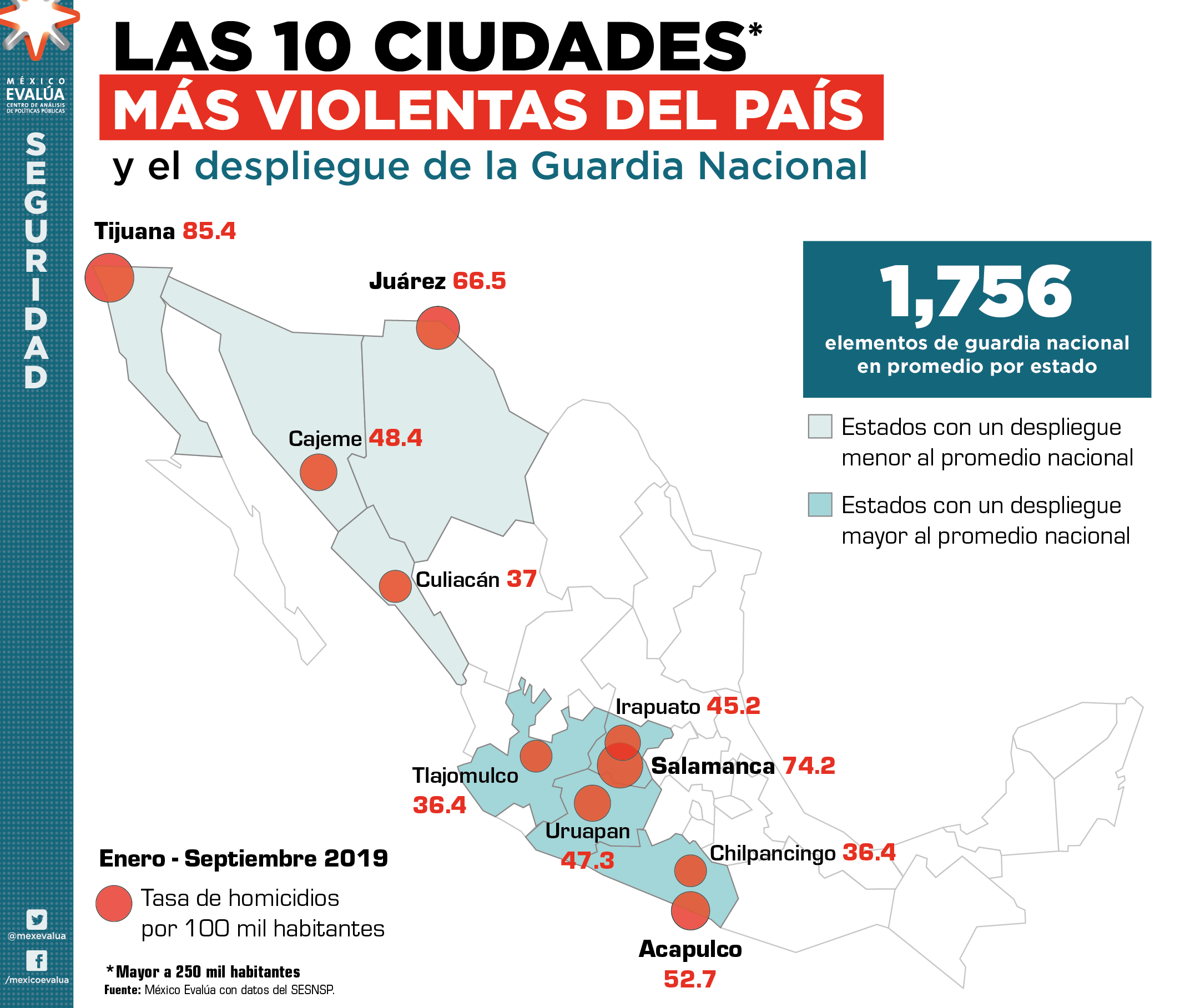 México Evalúa identificó las 10 ciudades (más de 250 mil habitantes) más violentas del país en lo que va del año y las contrastó con el promedio de elementos de la Guardia Nacional que están desplegados en cada entidad (1,756). Esto, con la finalidad de conocer, de manera general, los recursos que se están destinando a cada foco rojo.