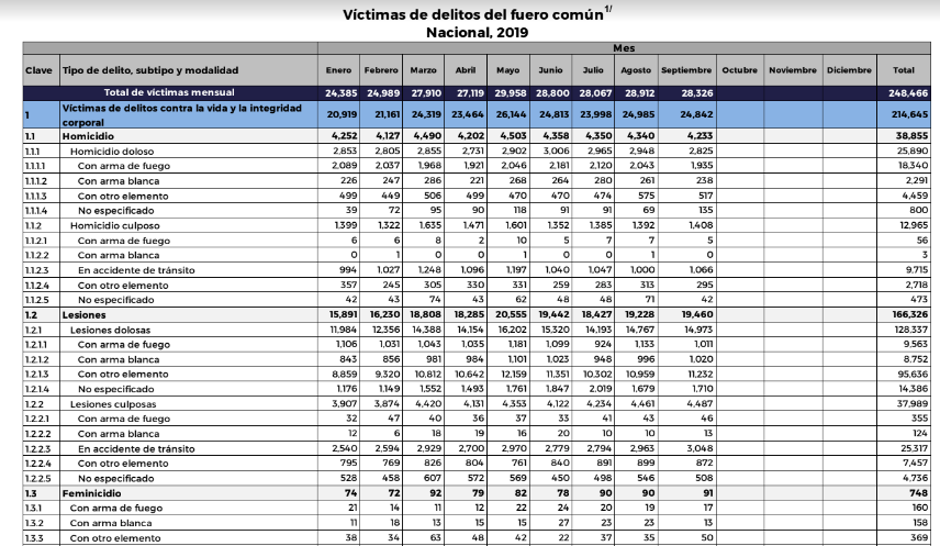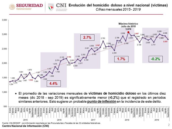 Pero como apunta México Evalúa: “Las víctimas de homicidios se han incrementado durante la actual administración. De diciembre de 2018 a septiembre de 2019 se registraron 29,629 víctimas de homicidio doloso (incluyendo feminicidios) en el país. Esta cifra equivale a un incremento de 3.7% respecto al mismo periodo del año anterior, que tuvo 28,579 víctimas”.