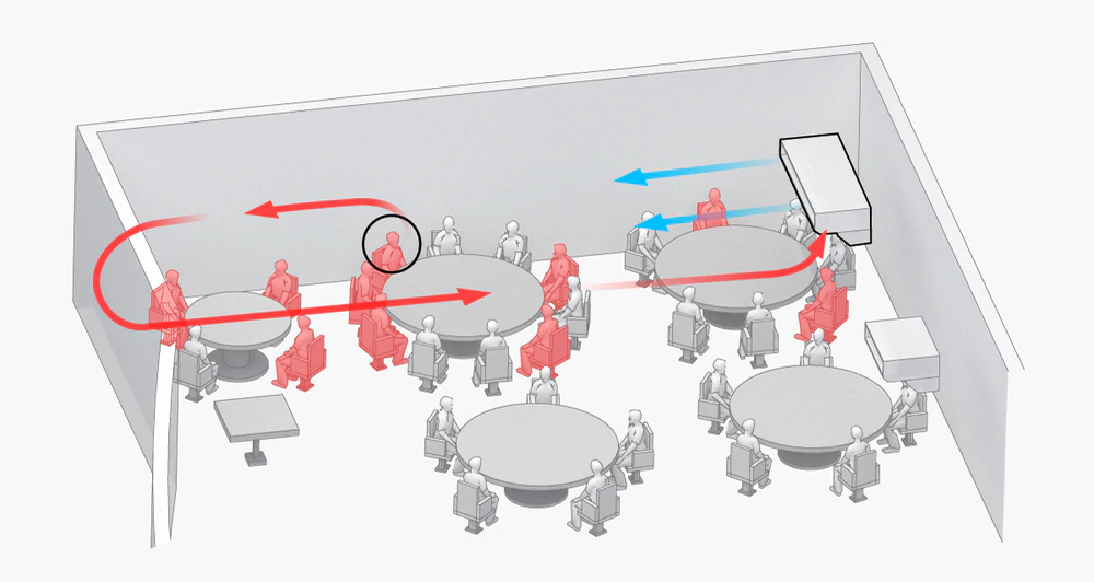 Una comida de Año Nuevo en Guangzhou el 24 de enero es el mejor ejemplo de los riesgos que se pueden evitar en locales cerrados. Ese escenario ha sido analizado en detalle en dos estudios distintos (1, 2) por parte de las autoridades sanitarias chinas y la conclusión es clara: la mala ventilación puede ser decisiva si el contacto se mantiene durante situaciones prolongadas. De nuevo, la ecuación que suma tiempo e interacción social multiplica los riesgos.