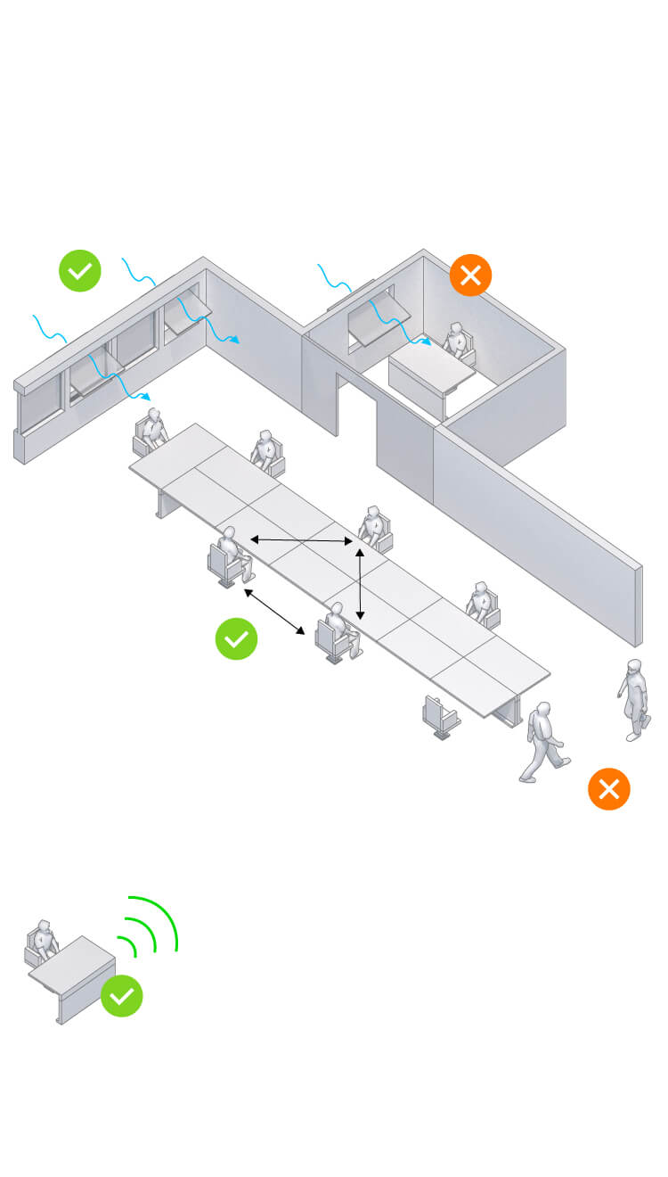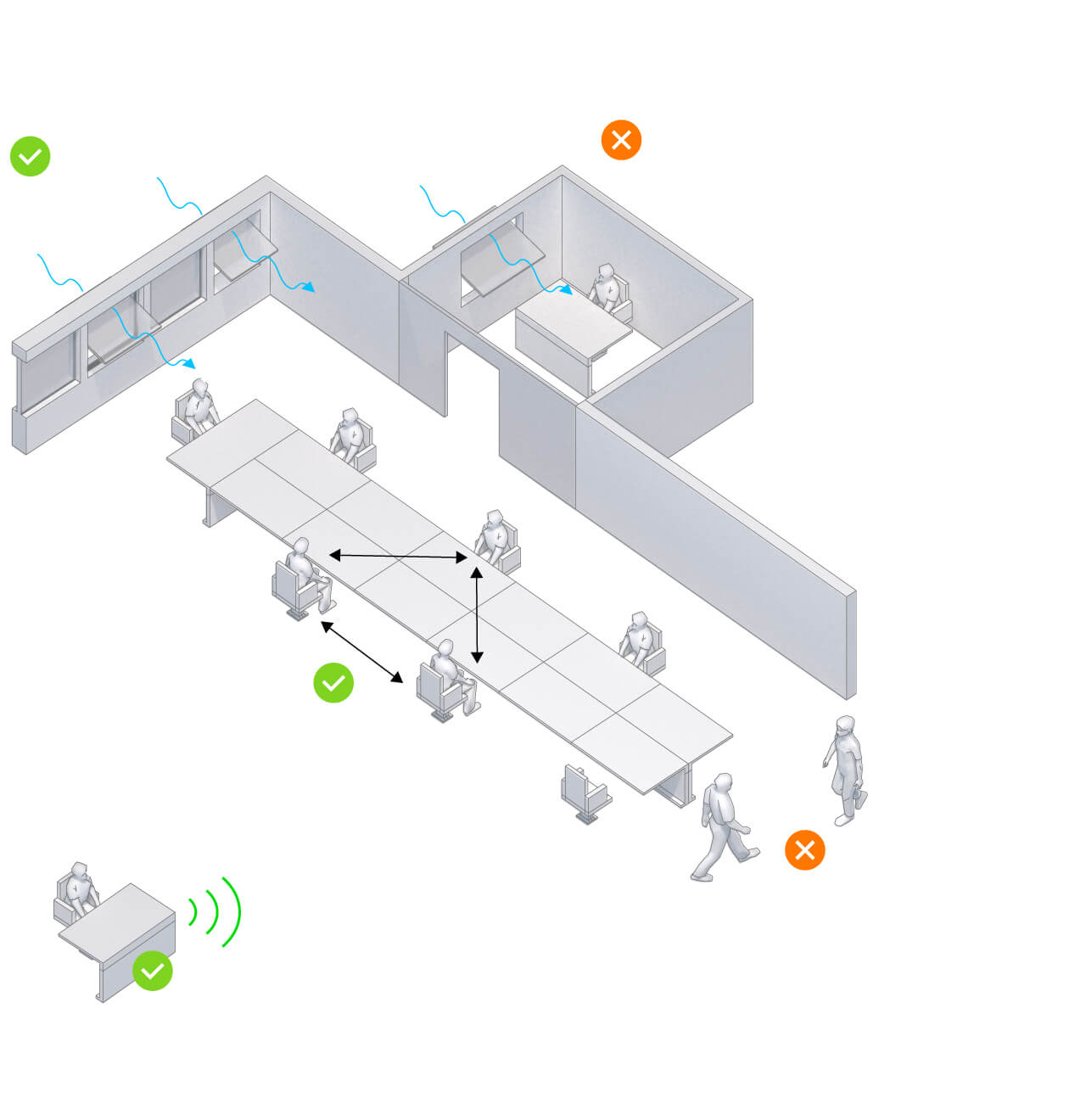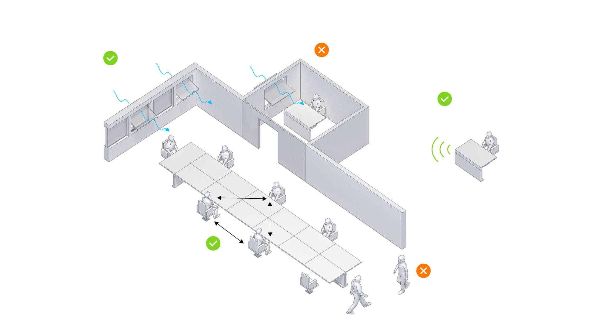 Las recomendaciones de los científicos y las autoridades sanitarias inciden en evitar esa multiplicación de riesgos evitando la concentración de personas en lo posible. Las medidas van desde decisiones administrativas como teletrabajar por turnos o cuando se presenten síntomas, hasta protecciones físicas como mascarillas o evitar que los empleados compartan materiales de oficina. Además, se recomienda la separación de los trabajadores, evitar aglomeraciones en reuniones, accesos o zonas de comidas, y mantener los espacios correctamente ventilados. “Debemos reducir la concentración de personas y el tiempo de exposición, el rato que pasan juntas. Si reducimos uno y otro factor, reducimos el riesgo”, resume Maricruz Minguillón, investigadora de IDAEA-CSIC.