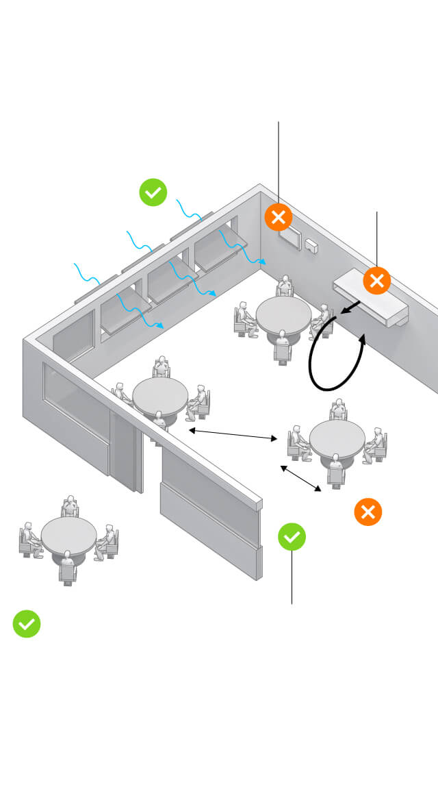 Ubicar a los trabajadores en las mesas en zig zag y a dos metros