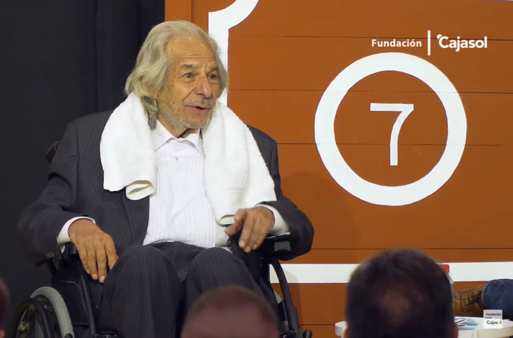 El veterano diestro se presentó en el escenario en silla de ruedas, enfundado en un traje oscuro, camisa blanca sin corbata, melena nevada, barba de varios días, una toalla sobre hombros y las secuelas en el rostro de sus 81 años cumplidos. Lo previsto es que mantuviera una charla con Antonio Lucas, pero lo suyo fue un monólogo sobre Juan Belmonte y Joselito, salpicado de sentencias firmes y graves, muy prudentes unas, y curiosas e indiscretas otras sobre aristas diversas sobre el toreo y su entorno. Y en un tono muy pausado y pensativo, balbuceante a veces, desgranó ideas ocurrentes y brillantes, casi todas desordenadas, de un viejo sabio, que hicieron las delicias de la concurrencia.