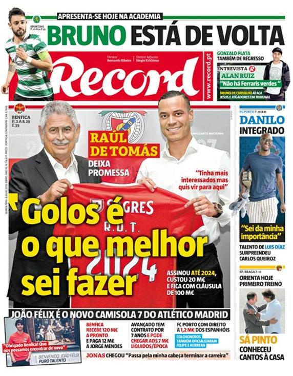 En todos los diarios son cuestiones relativas a la contratación de Raúl de Tomás por el Benfica o el objetivo de Marcano para el Porto, los que ocupan la primera plana.