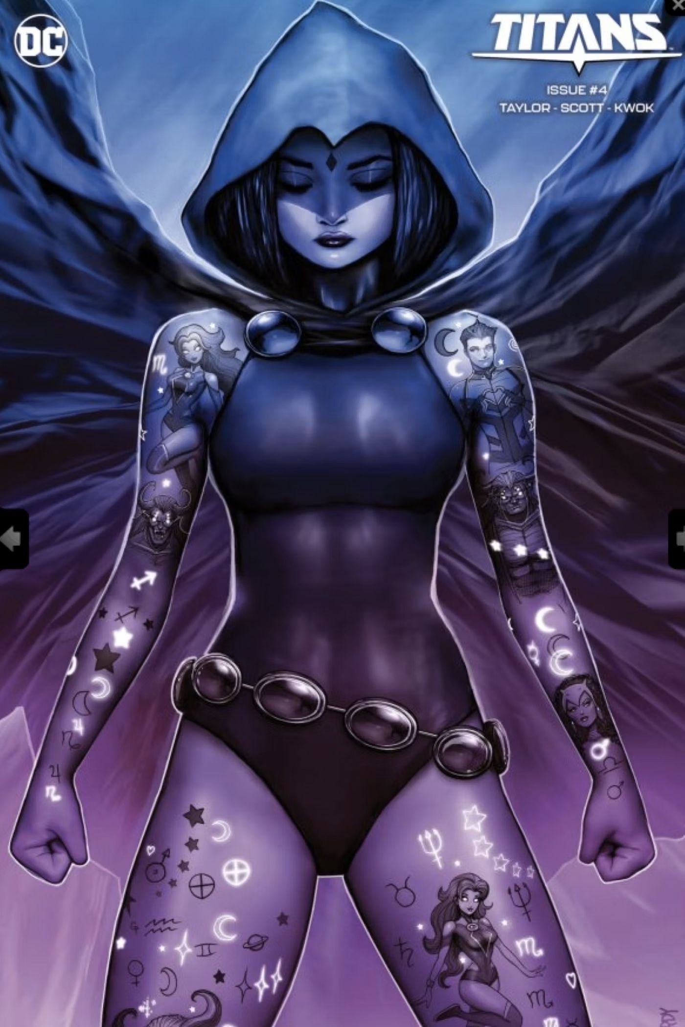 Dentro de la cautivadora portada ilustrada por Nathan Szerdy para el recién lanzado Titanes #4 del equipo creativo de Tom Taylor, Nicola Scott y Annette Kwok, Raven emerge adornada con un tapiz de tatuajes conmovedores que no dejan ningún centímetro de su piel intacto.