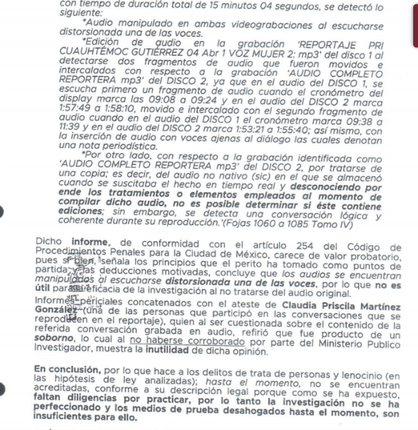 Además, se establece que las declaraciones ministeriales de Claudia Priscila Martínez González sobre un presunto soborno de 30 mil pesos para hacer la grabación contra Cuauhtémoc Gutiérrez, con duración de una hora y la participación de una mujer de nombre “Maribel”, nunca fue corroborada y tampoco se citó a dos mujeres, que el segundo filtro de la reclutadora para la red de prostitución, identificó como Brenda “N” y Rocío “N”.