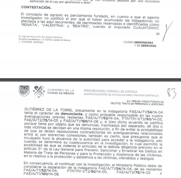 En un acuerdo enviado al Juez Décimocuarto de Distrito de Amparo en Materia Penal de la Ciudad de México, la Procuraduría local reconoció que la gestión de los exprocuradores Rodolfo Ríos Garza y Edmundo Garrido Osorio otorgaron a la defensa de Gutiérrez de la Torre la calidad de “coadyuvante” o auxiliar del Ministerio Público en las denuncias presentadas en su contra, lo que representa una violación a los derechos de las tres mujeres que denunciaron al ex líder priista desde mayo del 2014.