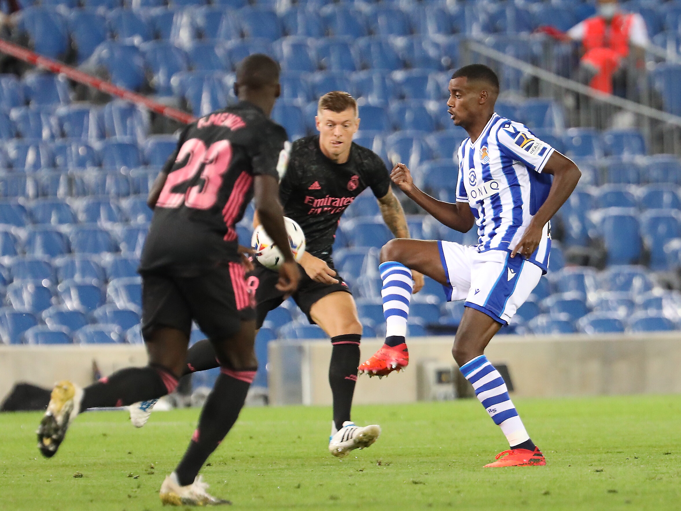 La Real Sociedad se defendió bien, esperando su oportunidad que no llegaba. Benzema fue el que tuvo la ocasión más clara, pero no acertó, lo mismo que Vinicius que también pudo marcar. La Real Sociedad se dio cuenta que el Real Madrid no era tan fiero como lo pintaban y pudo irse al descanso mandando en el marcador. La tuvo Isak en el minuto 43, pero apareció el pie de Courtois para evitar el gol donostiarra.