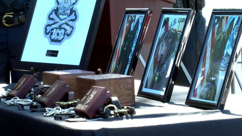 En memoria, sus cenizas fueron dejadas junto a sus fotografías y placas de oficiales de agentes de Aduanas y Protección Fronteriza de los Estados Unidos y se entregaron banderas a los agentes manejadores de estos nobles animalitos.
