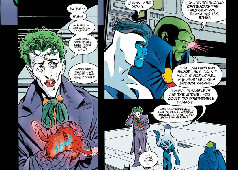 Uno de los primeros ejemplos del Joker recuperando la cordura y expresando arrepentimiento por sus acciones fue en JLA #15. Durante esta historia, Martian Manhunter reorganiza la mente del Joker, otorgándole cordura temporal. Martian Manhunter no es capaz de aguantar esto por mucho tiempo, mientras la mente del Joker lucha por volver a la locura, pero durante sus breves momentos de lucidez, inmediatamente expresa arrepentimiento y culpa por las muchas vidas que ha quitado. Si bien pude ver a algunos fanáticos descartando esto como solo una interpretación, esta idea de que el Joker sería una buena persona si no estuviera loco aparece varias veces.