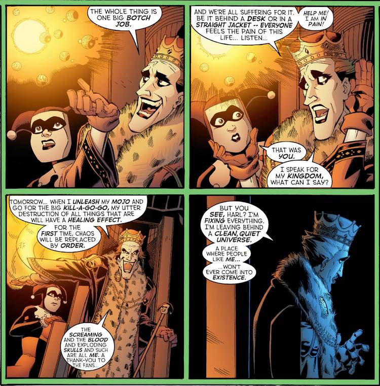 en lo fantástico Emperador Joker En la historia, el Joker le confiesa a Harley Quinn que la razón por la que quiere usar sus nuevos poderes divinos para destruir el universo es porque lo considera un reinicio. Está acabando con todo el caos y la miseria de una vez por todas.destruyendo el sistema roto que permitió que personas como él entraran en la creación. Si bien esta es una forma retorcida de salvar el universo, el Joker todavía está completamente “loco” en esta historia, lo que significa que incluso con su locura intacta, todavía quiere hacer algo bueno a su manera.