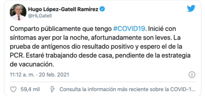 El sábado 20 de febrero, Hugo López-Gatell informó que padecía Covid-19 po rloq ue trabajaría desde casa.