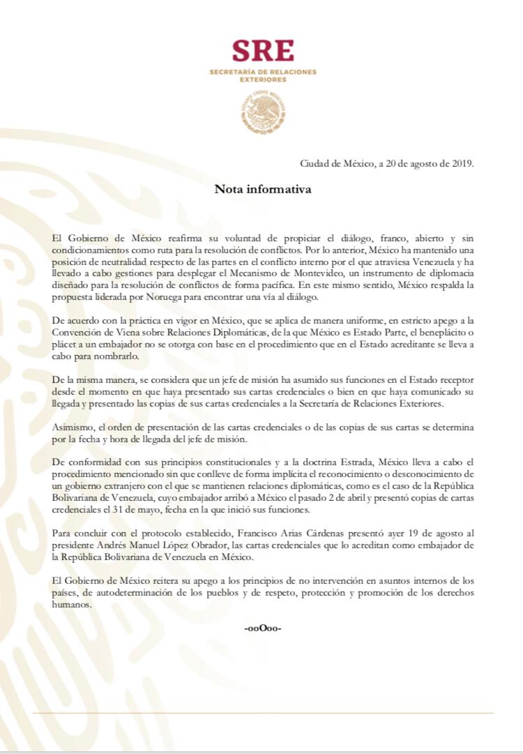 “México lleva a cabo el procedimiento mencionado sin que conlleve de forma implícita el reconocimiento o desconocimiento de un gobierno extranjero con el que se mantienen relaciones diplomáticas, como es el caso de la República Bolivariana de Venezuela, cuyo embajador arribó a México el pasado 2 de abril y presentó copias de cartas credenciales el 31 de mayo, fecha en la que inició sus funciones”, detalló.