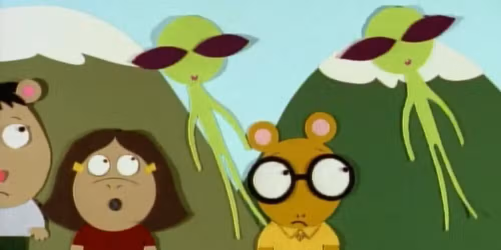 Luego se muestran estas ideas de historias, todas animadas en diferentes estilos. El conejo Buster va primero, y su historia, “El día que se salvó la Tierra”, se presenta con el mismo estilo de animación stop-motion y recortes de cartón de parque del sur. En el corto, Arthur incluso es abducido por extraterrestres delgados y verdes, que se parecen sorprendentemente a los de parque del sur.