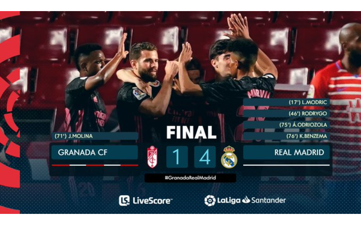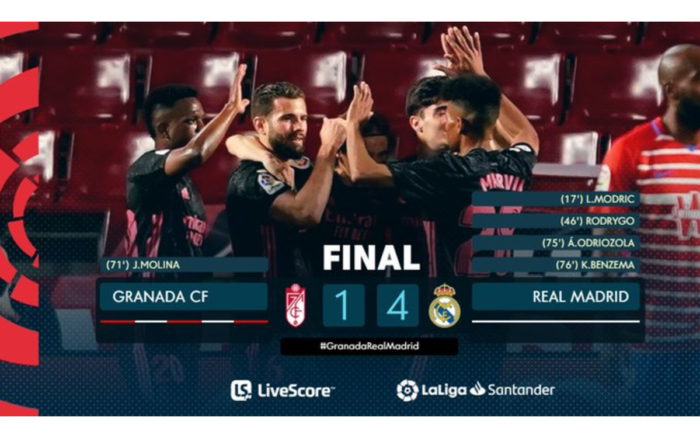 Los goles dol conjunto merengue fueron obra de Luka Modric al minuto 17, Rodrygo al 45+1′, Álvaro Odriozola al 75′ y Karim Benzema al 76′; en tanto, el conjunto granadino marcó por conducto de Jorge Molina al 71′.