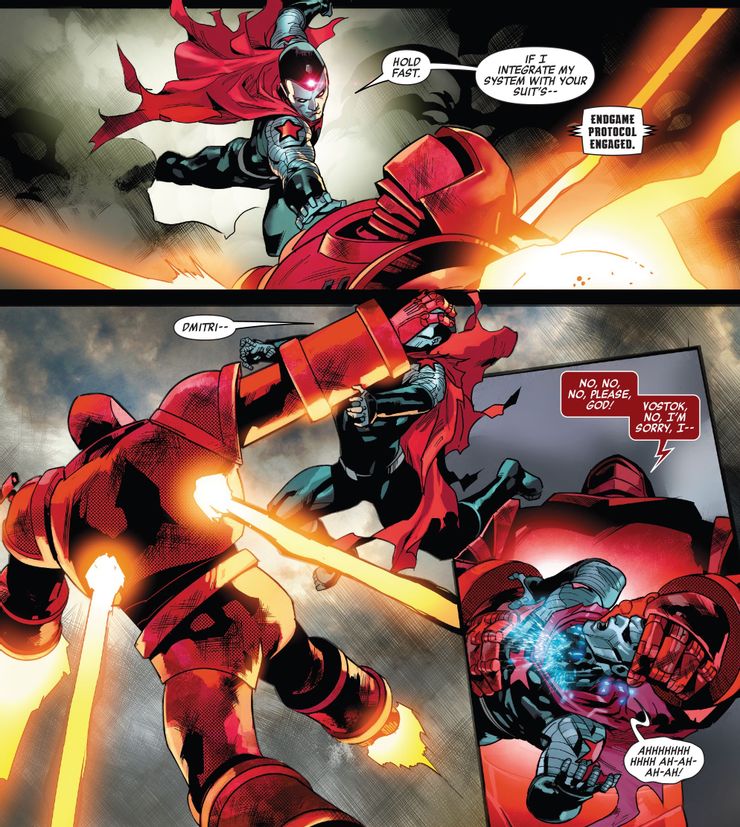 Mientras Red Guardian y Yelena obtuvieron un disco duro que contenía información sobre la última misión autorizada de Shostakov con el nombre en código Snowblind, la Guardia de Invierno llegó antes de que pudieran escapar. Sin embargo, Red Guardian no estaba más que preparado, habiendo tenido toda la base aérea abandonada equipada con trampas explosivas. No solo eso, sino que manejó fácilmente a su Vanguard de reemplazo antes de estar rodeado por toda la Guardia de Invierno. Aquí fue donde Shostakov jugó su carta final al piratear los sistemas de Crimson Dynamo para hacerlo atacar a sus compañeros de equipo, lo que resultó en la muerte brutal del sintezoide Vostok. El tipo de tácticas es algo a lo que Steve Rogers nunca recurriría, lo que demuestra que si bien el Capitán América es un Súper Soldado, el Guardián Rojo es un operaciones encubiertas Súper sólido.