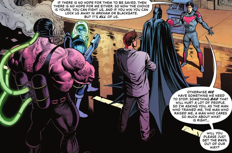 Increíblemente, Batman cede y permite que Bane, Freeze y Two-Face ayuden a Red Hood mientras investigan el nefasto trabajo del Sr. Bloom, quien ha estado orquestando toda la operación detrás de escena. Según Jason, si no hay esperanza de que los tres villanos sean redimidos, entonces no hay esperanza para Red Hood, quien ciertamente experimentó su propia oscuridad. Al recordarle a Batman que fue criado y entrenado por el propio Caballero de la Noche, Jason cree que debería ser digno de su confianza. Es un gran momento para el hijo y su padre sustituto, que rara vez se ponen de acuerdo en algo más allá del deseo de acabar con los criminales (aunque tienen definiciones diferentes de lo que parece).