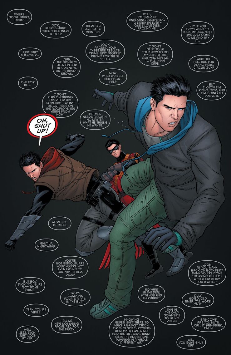 Dick regresa a Ciudad Gótica en Grayson #12, escrito por Tom King con arte de Mikel Janin, y cuando la Bat-Familia descubre que Dick no había murió, las reacciones son mixtas. Bárbara está decepcionada pero no sorprendida, mientras que Damián está emocionado. Sin embargo, Jason está furioso. Saluda a Dick con un puño en la cara y exclama que fue al funeral de Dick (lo cual es importante, porque Dick no fue al de Jason). el le dice, “No me importa lo que Bats te haya dicho, no le hagas eso a tu, ¡no le hagas eso a otro Robin!”
