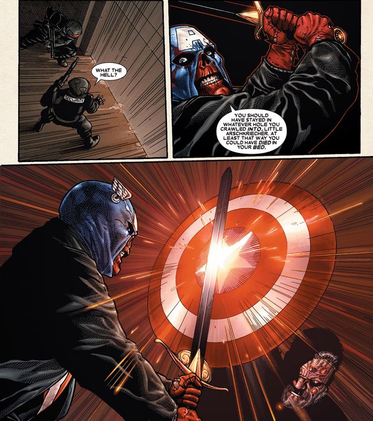 Años más tarde, cuando Old Man Logan decidió convertirse en un héroe una vez más tras la muerte de Hawkeye, el anciano Wolverine logró entrar en el santuario interior de Red Skull cuando sus agentes pensaron que Logan estaba muerto después de que le dispararon. Descubrir que ese no era el caso en Lobezno #72 (viejo logan parte 7) de Mark Millar y Steve McNiven, Red Skull empuñó la Ebony Blade contra Wolverine mientras los dos luchaban hasta la muerte. Si bien su duelo finalmente sería el último de Red Skull, el hecho de que muriera empuñando la espada más oscura del Universo Marvel es ciertamente un testimonio de sus logros como supervillano en este futuro sombrío (además de usar los restos de la máscara del Capitán América).
