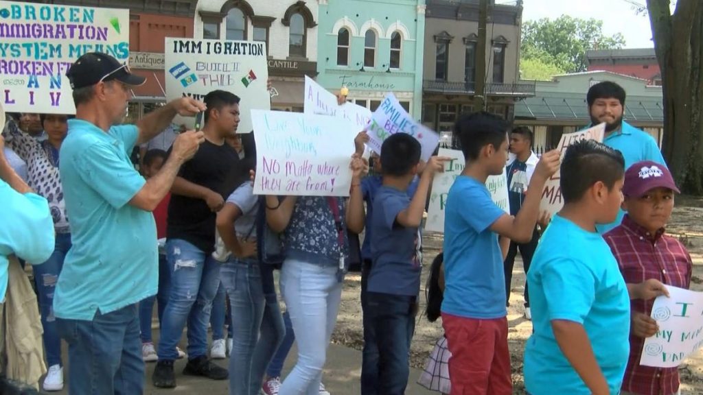 Formaban parte de un grupo de varias docenas de manifestantes que marcharon desde la iglesia hasta la plaza principal de Canton en protesta por los 680 arrestos de inmigrantes efectuados el miércoles 7 de agosto en siete plantas procesadoras de pollo de Mississippi.