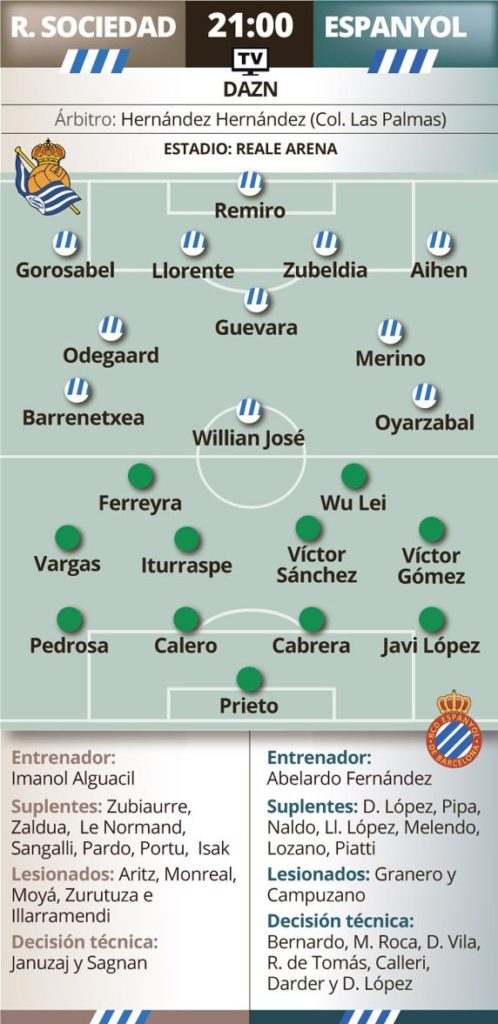 En este escenario, la Real refuerza su condición de favorita a pesar de esa imagen de hace tres días por cuanto Imanol está dispuesto a emplear a sus mejores elementos en el verde, a pesar de que jugaron hace tres días en el Benito Villamarín y dentro de cuatro tendrán enfrente al Mallorca de nuevo en Anoeta. Y Abelardo tiene un concepto contrario de esta ronda copera. Para el último de la fila en Liga, esta competición está más allá del segundo plano. Por eso el entrenador dejó la friolera de siete titulares en Cornellà ayer: David