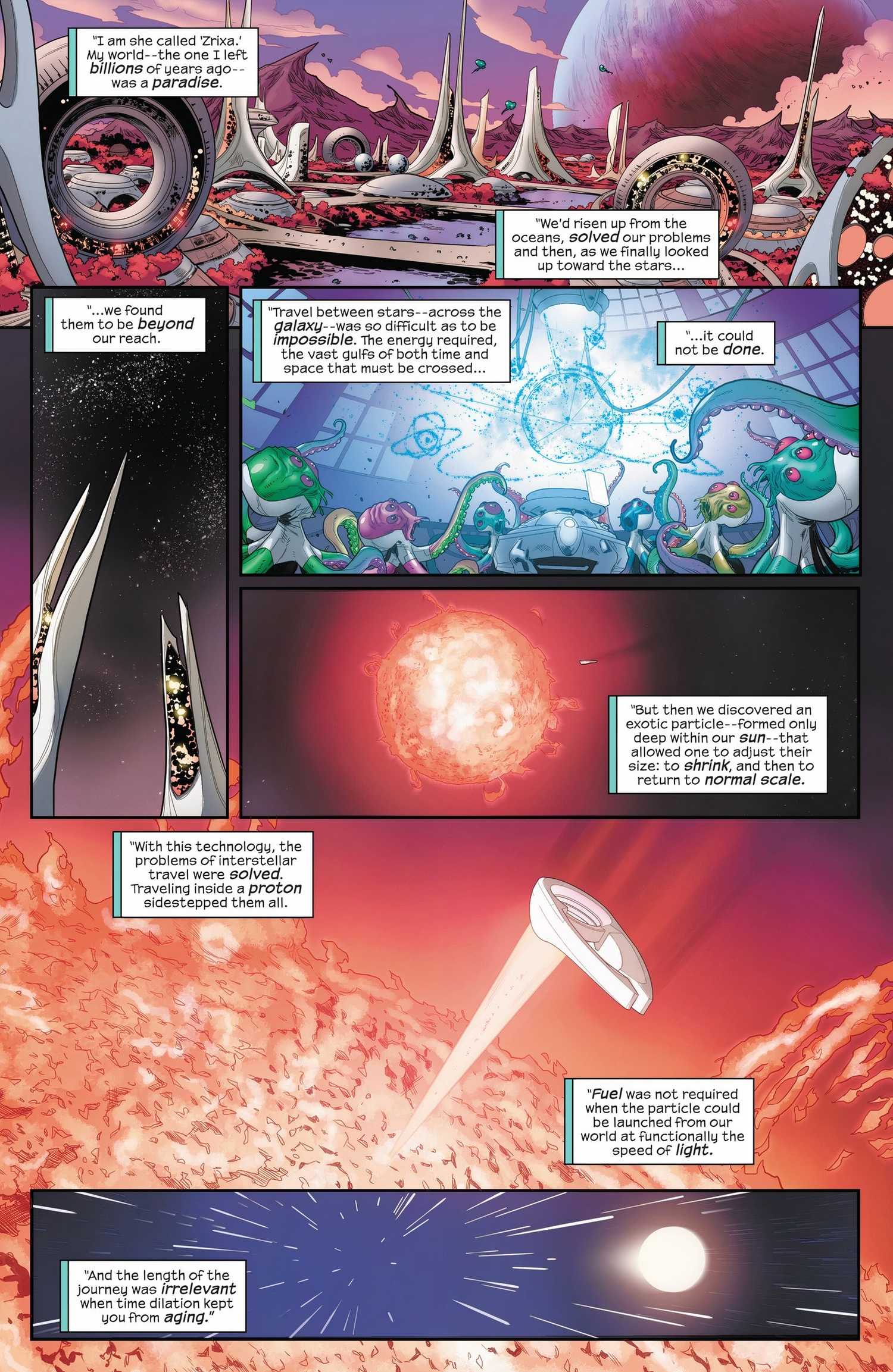 Los Cuatro Fantásticos incluyen a algunos de los superhéroes más avanzados de Marvel. El equipo está prácticamente repleto de genio, y Mister Fantástico suele ser capaz de convertir sus mejores ideas en inventos prácticos y del mundo real que se acercan lo más posible a la “magia” que la ciencia puede lograr. Sin embargo, ni siquiera Reed había concebido el tipo de viaje que había descubierto Zrixa, todo posible gracias a una partícula especial alojada en el sol de su planeta. Permitió que su especie se encogiera lo suficiente como para entrar en un protón y lanzarse fuera de su planeta a algo cercano a la velocidad de la luz, recorriendo distancias insondables tan rápidamente que sus cuerpos no envejecerían.