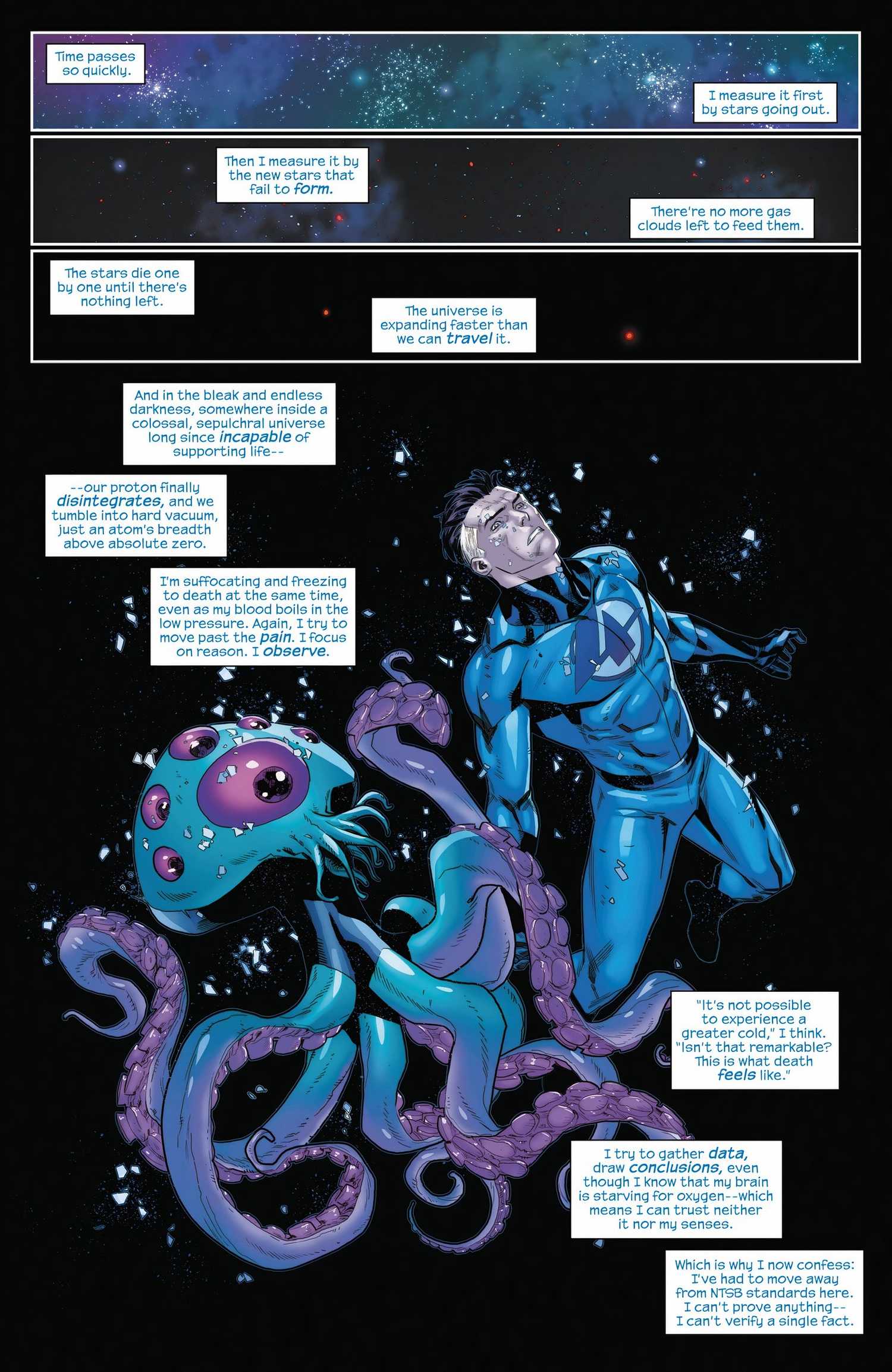 Los cuatro fantásticos #24 de Ryan North y Carlos Gómez por fin Resuelve el misterio de las partículas OMG Mientras bombardean la Tierra, el equipo encuentra a un extraterrestre llamado Zrixa. Las “partículas” son en realidad protones que contienen miembros de la especie de Zrixa que usaron las naves improvisadas para escapar de su planeta natal, situado a miles de millones de años luz de la Tierra.