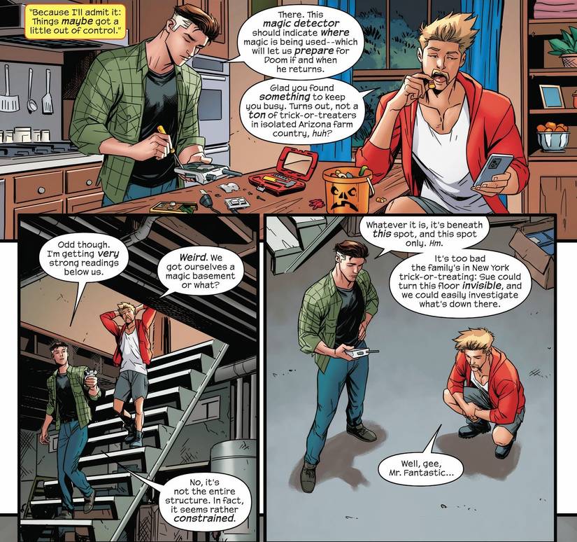 En Los cuatro fantásticos #26 – escrito por Ryan North, con arte de Ivan Fiorelli, Brain Reber y Joe Caramagna, Reed termina de retocar su última hazaña de ingeniería cuando completa su detector mágico. Según él, “indicará dónde se utiliza la magia”. El propósito inmediato del dispositivo es ayudarlos a localizar y prepararse para el Dr. Doom, quien ahora ejerce más poder que nunca. Sin embargo, en un sentido más amplio, les da a los Cuatro Fantásticos una clara ventaja contra cualquier usuario de magia. Si los cálculos de Reed son correctos, Su detector de magia permitirá a los Cuatro Fantásticos identificar a cualquier usuario de magia y estar siempre un paso por delante de él.