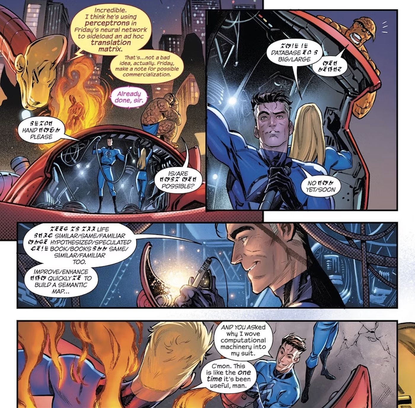 - #12, Reed Richards revela que ha tejido tecnología informática en su disfraz, lo que le permite traducir idiomas y provocar caos en un universo alternativo.