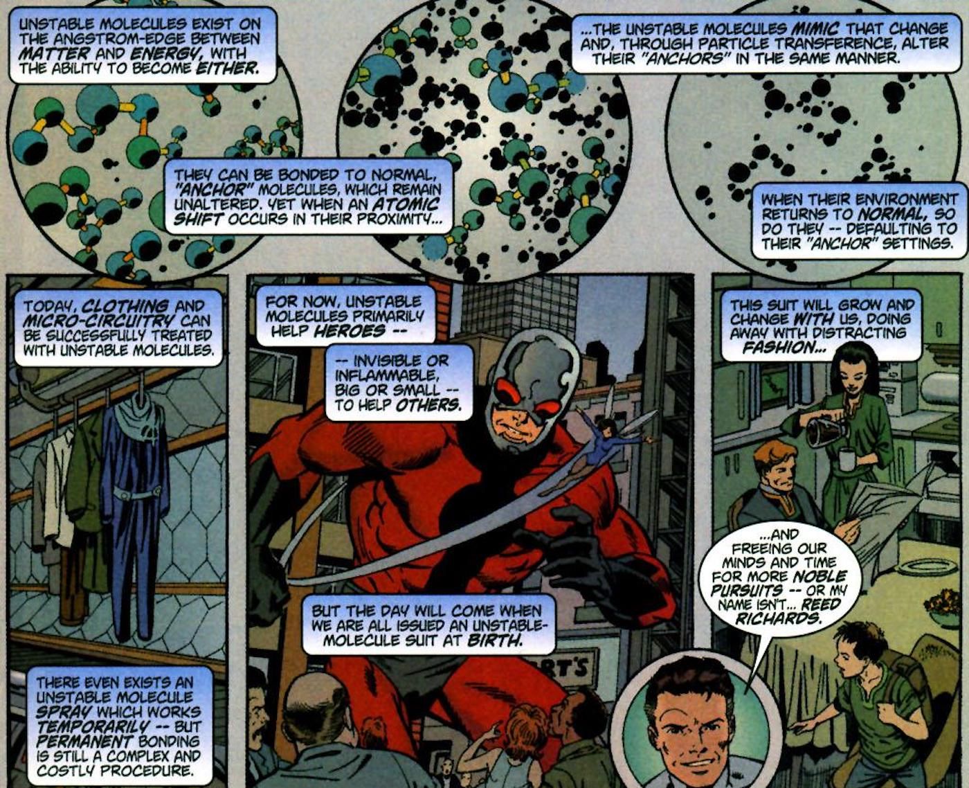 Esta tampoco es la primera vez que se almacenan datos sobre moléculas inestables. Temerario (2011) #6 (escrito por Mark Waid, dibujado a lápiz y entintado por Marcos Martín, coloreado por Muntsa Vincente y escrito por Joe Caramagna) presenta “Omega Drive”. Esta es una pieza de un disfraz de los Cuatro Fantásticos que se ha convertido en un disco duro gigante que contiene datos sobre diferentes grupos criminales y terroristas del Universo Marvel, incluidos AIM e HYDRA. El hecho de que las moléculas inestables tengan el potencial de codificar enormes cantidades de datos, sin mencionar sus propiedades adaptables regulares, las hace enormemente valiosas, por lo que no es de extrañar que Reed no siempre sea comunicativo con su tecnología.