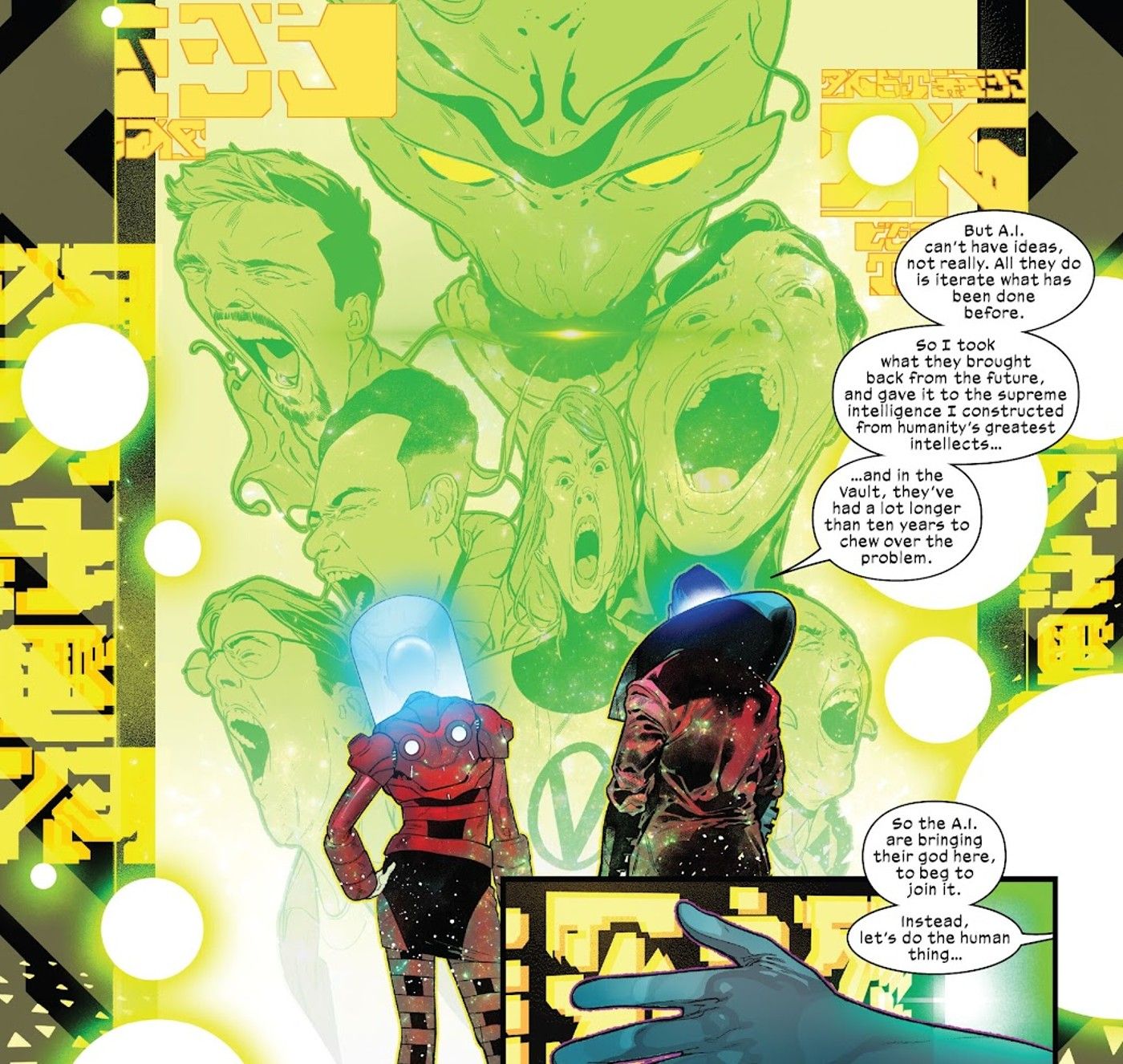 Esto ya estaba en la planificación de Jon con los Dominios: son literalmente máquinas que se forman a partir de la inteligencia que han consumido, una clara analogía de cómo [machine learning] Se fabrican modelos. Ciertamente, cuando los escribo, uso un lenguaje que evoca el lenguaje actual en IA. Pensé que había una toma externa en la que Disney nos despide a todos cuando la era Krakoan termine, y el nuevo equipo de Tom es solo un montón de guiones de ChatGPT. Después de todo, la IA ganó.