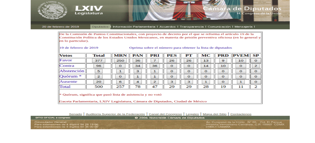 De acuerdo con la Secretaría de Servicios Parlamentarios de San Lázaro, la reforma al artículo 19 constitucional que sólo contemplaba la prisión automática para ocho delitos, incluyendo el homicidio doloso y delincuencia organizada, contó con el voto favorable de 36 diputados del PAN, 13 de Movimiento Ciudadano, 7 del PRI y uno del PRD.