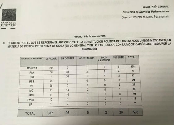 De acuerdo con la Secretaría de Servicios Parlamentarios de San Lázaro, la reforma al artículo 19 constitucional que sólo contemplaba la prisión automática para ocho delitos, incluyendo el homicidio doloso y delincuencia organizada, contó con el voto favorable de 36 diputados del PAN, 13 de Movimiento Ciudadano, 7 del PRI y uno del PRD.