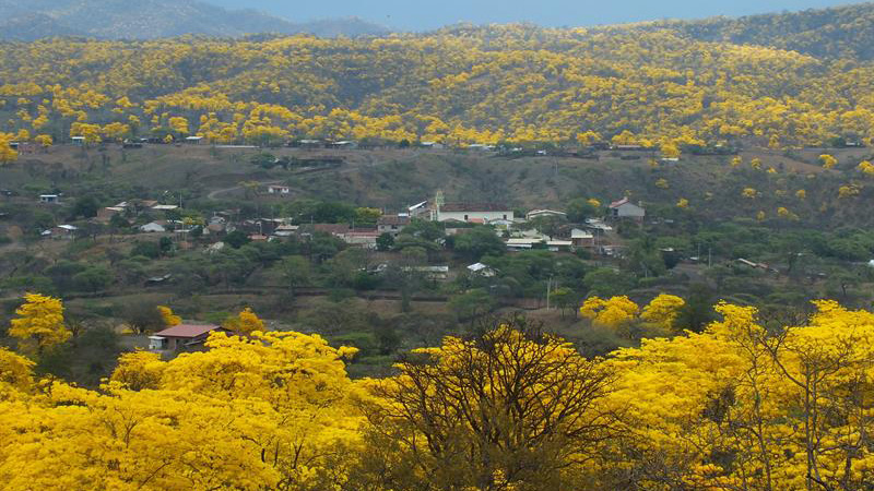Las primeras lluvias de invierno sobre un bosque seco en el cantón Zapotillo, en el sur de Ecuador, alientan el surgimiento de las flores amarillas de cientos de guayacanes, convirtiendo a 40,000 hectáreas en un manto color oro que cautiva a miles de turistas e inspira a artistas.