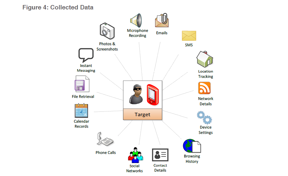 Al tener control del dispositivo, los espías pueden usarlo como quieran: tienen acceso a los archivos, mensajes de texto, aplicaciones, fotografías, agenda, historial de navegación y localización GPS.