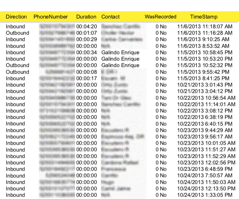 La tabla de llamadas informa si la comunicación llegó o fue realizada por el entonces funcionario; se incluye el número telefónico, la duración, el contacto o número telefónico correspondiente, además de la fecha y hora. Una casilla también indica si la llamada fue grabada o no.