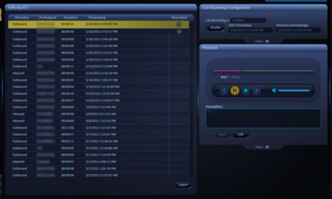 Se trata de una tabla que resume las llamadas del blanco: el sistema indica la dirección de la llamada (entrante o saliente), el contacto o teléfono, la duración y la estampa de tiempo de la comunicación (minuto, hora, día, mes y año). Abajo a la derecha se puede apreciar el botón exportar, para poner los datos en una tabla manejable con otros programas comerciales.