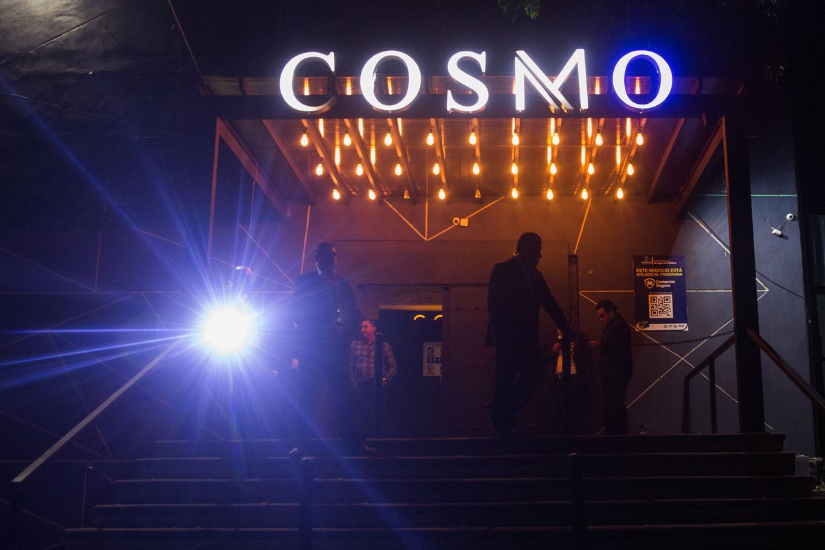 Es la 1.00 y Cosmo lleva ya un par de horas abierto. Cinco vigilantes de seguridad protegen la puerta. Para llegar hay que subir siete escalones y pasar dos cadenas metálicas. Vistos en contrapicado desde la acera, los cadeneros parecen efigies antiguas protegiendo el Partenón. Hace un mes asesinaron a uno de sus compañeros aquí mismo. Un riña con unos clientes borrachos que querían entrar acabó en otra balacera. A las preguntas del reportero responden con monosílabos. No estaban aquella noche. No saben nada. Y una sola frase: “Este es un sitio bien. Hoy es noche de niñas”.