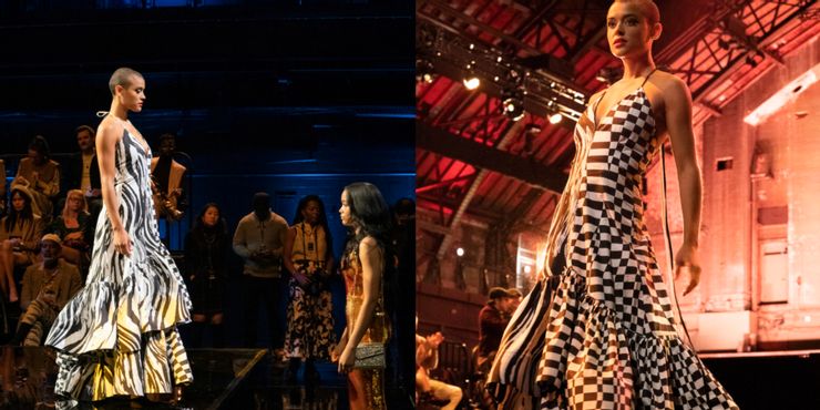 El gran momento de Julien como protagonista en el episodio debut de Chica chismosa fue nada menos que extraordinario, y este magnífico vestido blanco y negro contribuyó a su éxito. Diseñado por Christopher John Rogers, el vestido se dividió por la mitad, con estampados mixtos en una silueta llamativa.