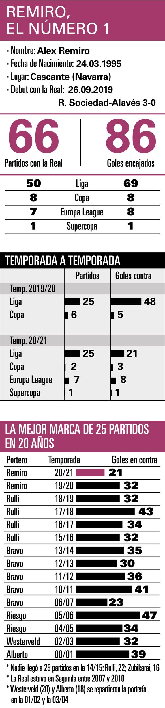 Remiro ha recibido 21 goles en estos 25 encuentros de Liga. Es la mejor marca entre todos los guardametas que han escoltado la portería de la Real en el Siglo XXI. Hay que remontarse, casi de memoria, a los tiempos de Arconada, para ver un balance superior al del navarro. Al campeón donostiarra le endosaron sólo 19 goles en 25 partidos en 1988. Hace 33 años.