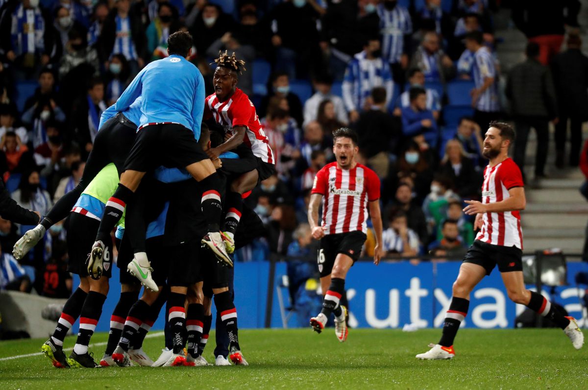 La acción del primer minuto pudo echar por tierra los planes de unos y otros. Fue cuando Williams corrió a un balón largo y superó con un toque a Remiro, que había salido fuera del área. El delantero del Athletic vio por delante la portería vacía pero se despistó una centésima de segundo, necesaria para que Aihen arriesgara al límite, se jugara el penalti y puede que la expulsión, y tocara ligeramente la pelota. Las imágenes ratificaron en el VAR lo que el árbitro había percibido sobre el césped. Hubiera sido un estropicio para los donostiarras, pero la velocidad de reacción del central de la Real devolvió la sangre al cuerpo de la afición local.