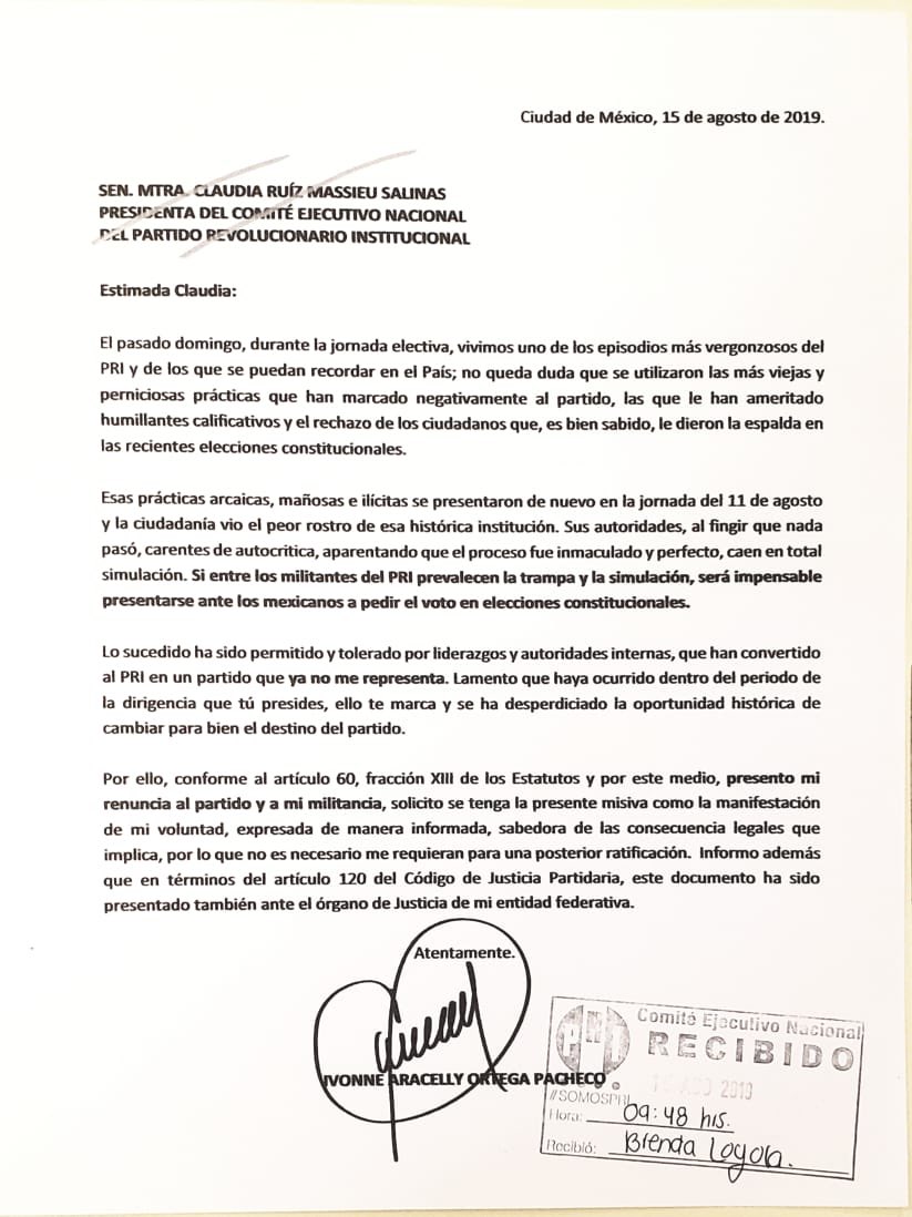 En congruencia con mis convicciones democráticas, hoy he presentado mi renuncia al PRI después de 29 años de militancia. Siempre estaré agradecida por las experiencias, las oportunidades y por los amigos y amigas que me brindó. pic.twitter.com/caYJ7tkB60 — Ivonne Ortega (@IvonneOP) August 16, 2019