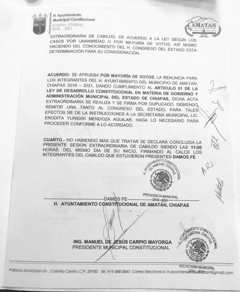 Por acuerdo se aprobó “por mayoría de votos la renuncia para los integrantes del H. Ayuntamiento del municipio de Amatán”.