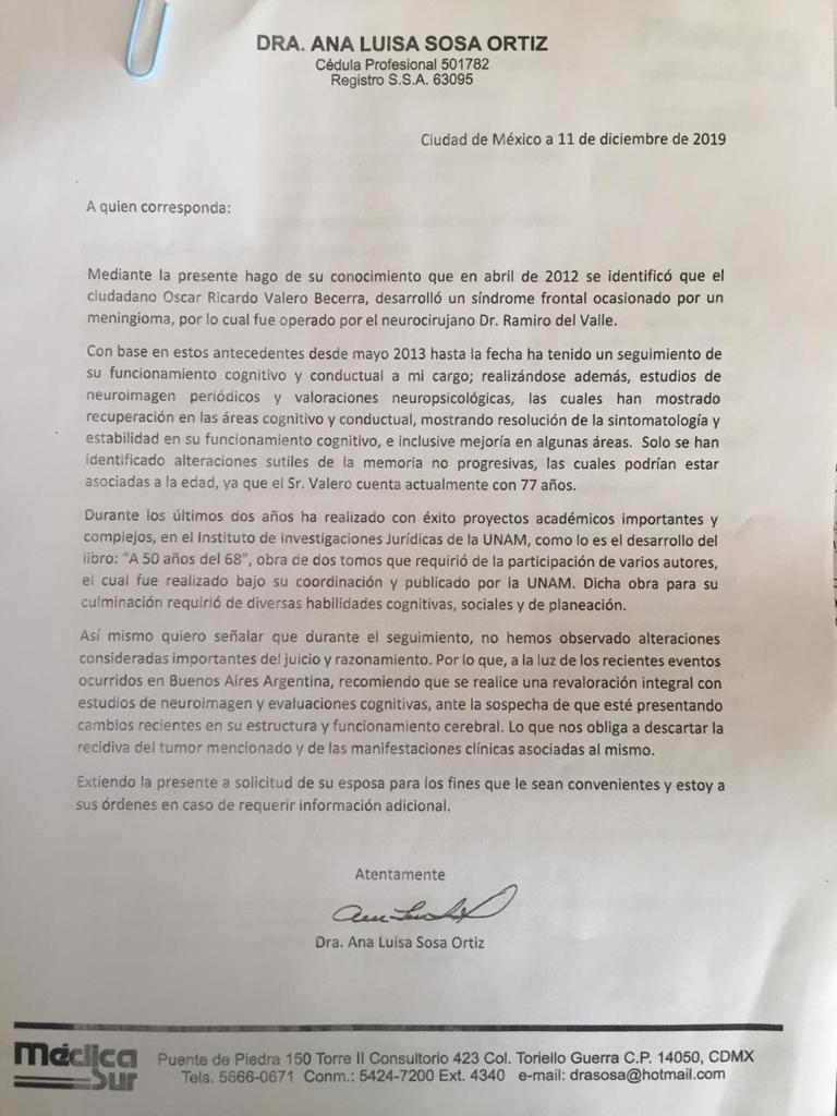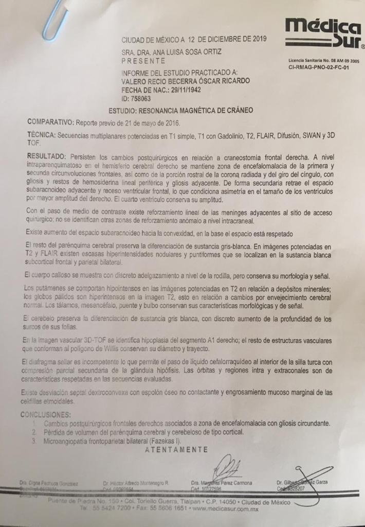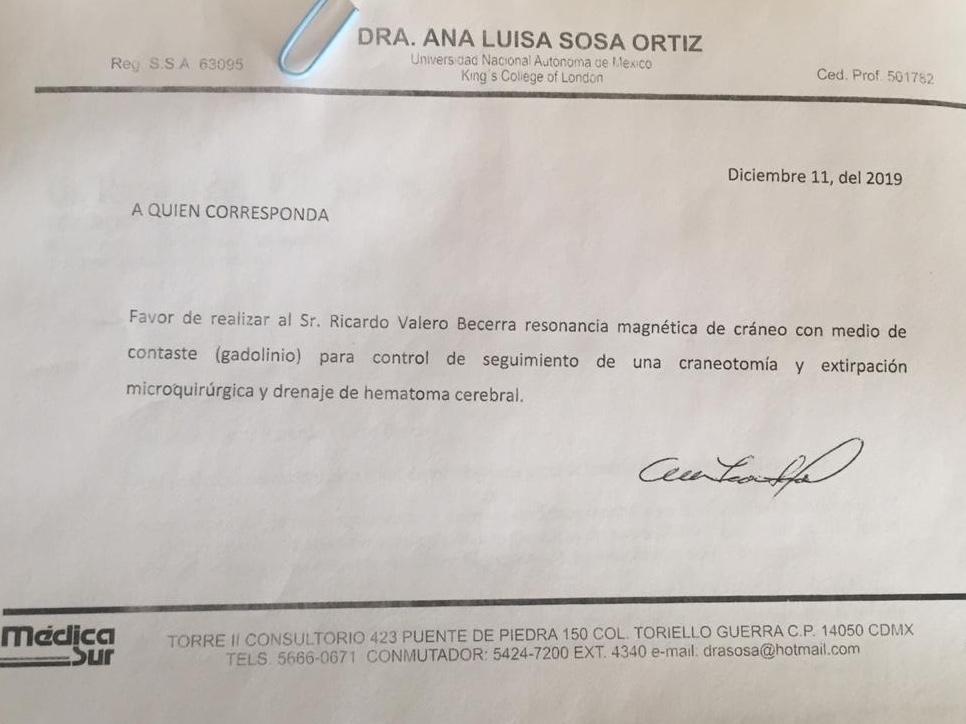 Tras darse a conocer la noticia, la dependencia federal dio a conocer reportes médicos de los chequeos neurológicos que se le han practicado a Valero en Médica Sur.